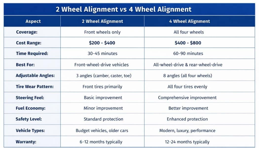 Two-wheel alignment works well for front-wheel-drive vehicles primarily. Many budget-conscious car owners choose this option for basic maintenance. However, rear wheel issues don’t get addressed with this approach. Your rear axle remains unchanged throughout the entire alignment process.